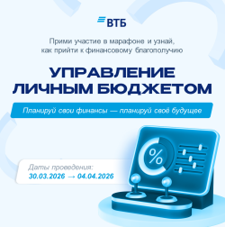 Приглашаем вас принять активное участие в марафоне ВТБ «Управление личным бюджетом». Марафон проходит c 30 марта по 4 апреля 2026 года. Используйте возможность приобрести знания, которые помогут планировать бюджет и управлять личными финансами!