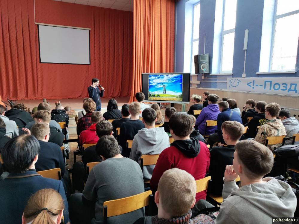 Сотрудники музея рассказали студентам об узловчанах, принимавших участие в Сталинградской битве – Королеве Иване, Смирновой Октябрине, были представлены личные вещи Борисова Николая. Студенты стали участниками викторины по итогам беседы, где смогли упрочить свои знания о битве. Сотрудники музея привезли экспонаты, к которым смогли прикоснуться студенты: снаряды, мины, каски, боевое оружие, медали и ордена.