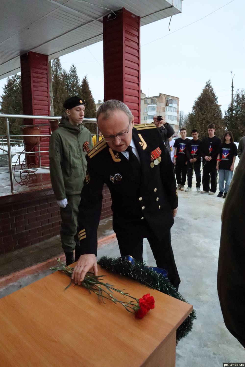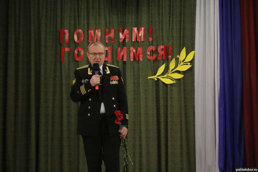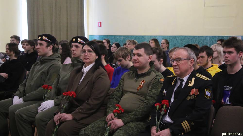 В зале собрались студенты и педагоги, чтобы отдать дань уважения землякам, чей подвиг стал символом мужества и верности присяге. Почётными гостями вечера стали председатель совета ветеранов войны, труда, Вооружённых сил и правоохранительных органов города Донского, капитан 2-го ранга Виктор Александрович Раст, капитан 3-го ранга Сергей Георгиевич Пламадяла, а также участник специальной военной операции, выпускник колледжа Алексей Михайлович Шестозуб.
