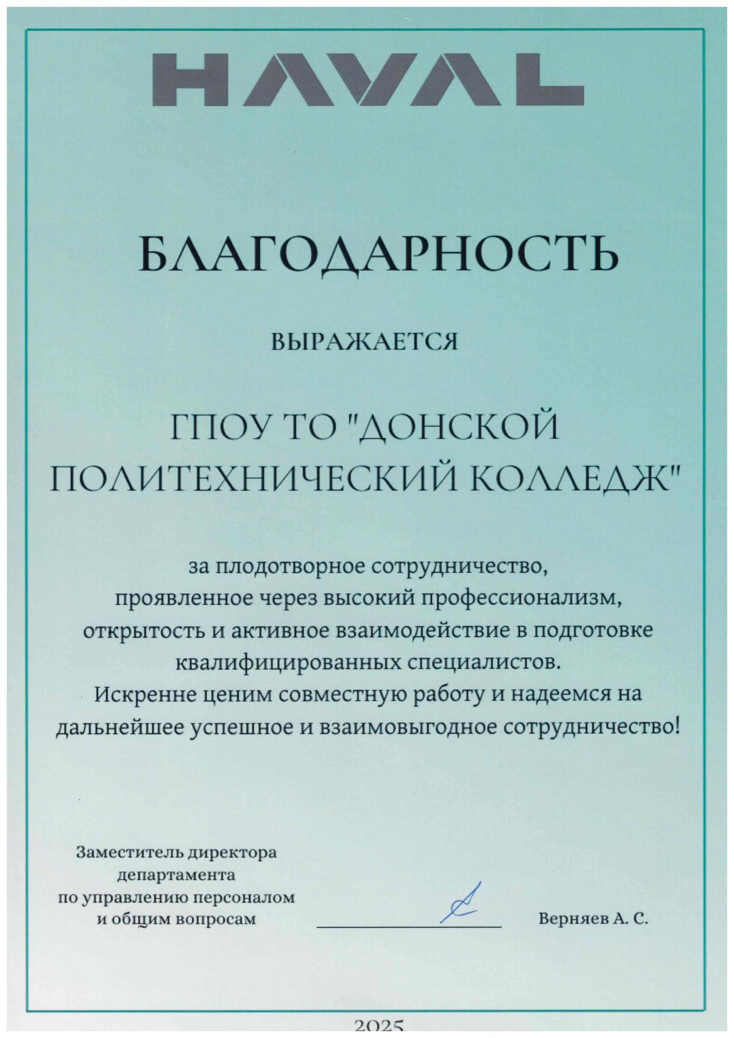 Благодарность ООО «Хавейл Мотор Мануфэкчуринг Рус» за плодотворное сотрудничество, проявленное через высокий профессионализм, открытость и активное взаимодействие в подготовке квалифицированных специалистов. 2025 год