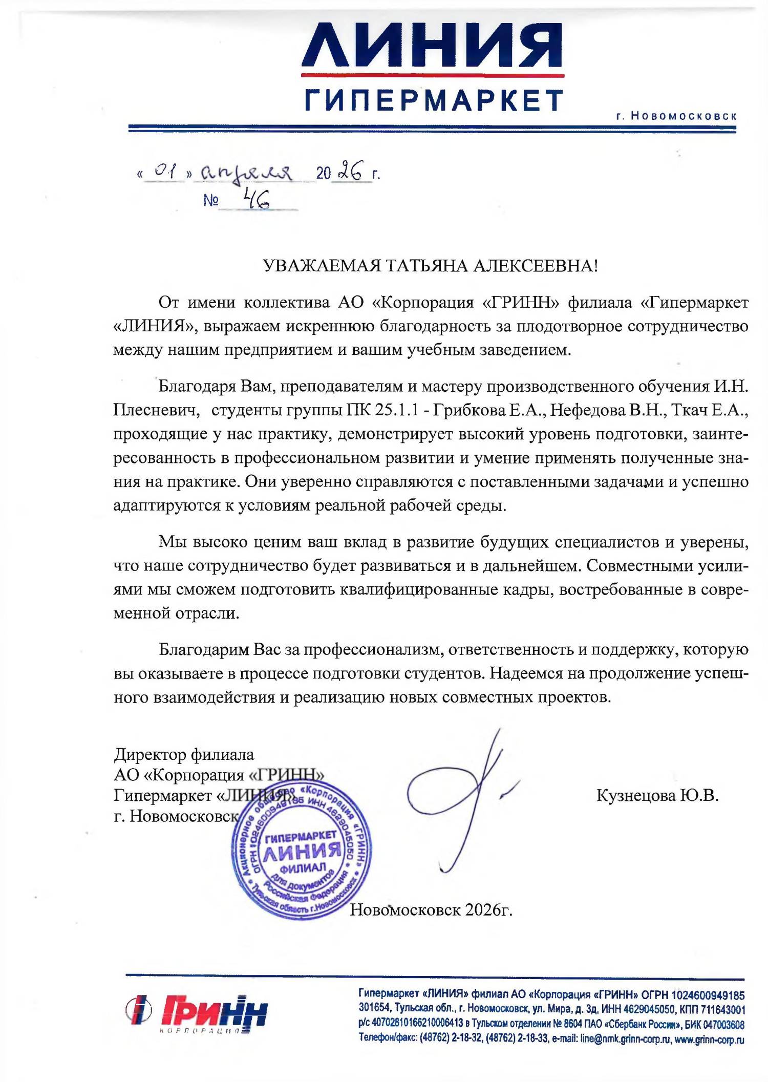 Благодарственное письмо АО «Корпорация «ГРИНН» филиала «Гипермаркет «ЛИНИЯ» за плодотворное сотрудничество между предприятием и учебным заведением. 2026 год
