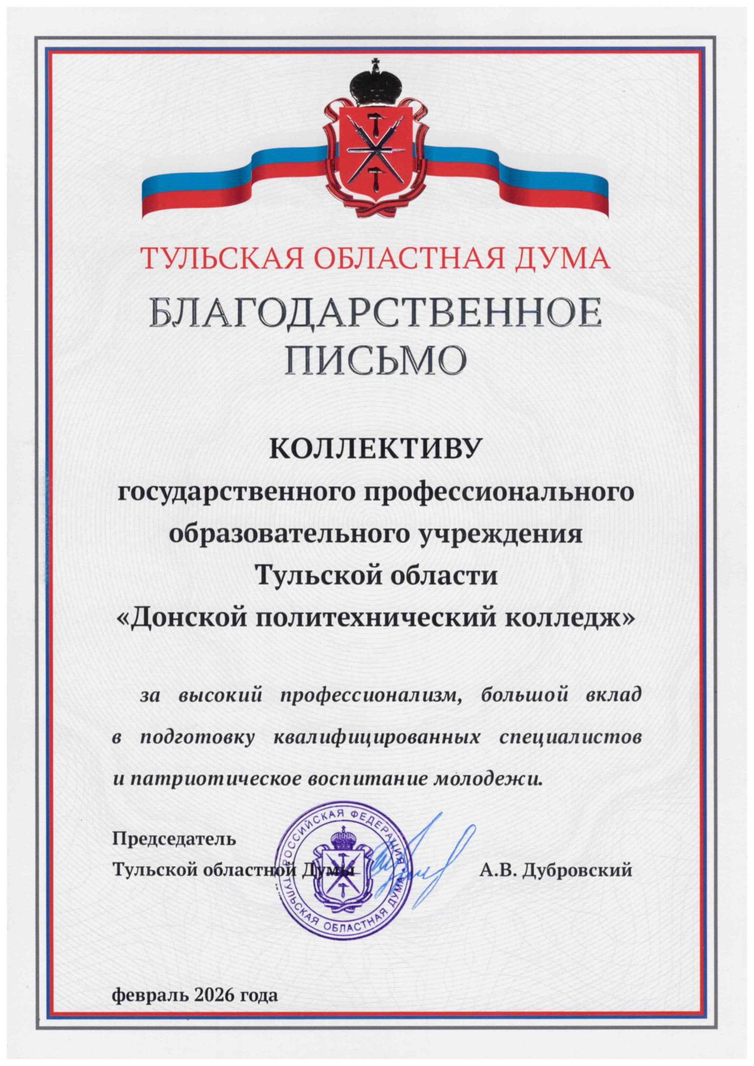 Благодарственное письмо Тульской областной думы за высокий профессионализм, большой вклад в подготовку квалифицированных специалистов и патриотическое воспитание молодежи. 2026 год