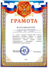 Грамота УМЦ «АВАНГАРД» Тульской области команде 2 взвода за 1 место в конкурсе «Смотр строя и песни», посвященном 80-летию Победы в Великой Отечественной войне 1941-1945 г.г. в Учебно-методическом центре (лагере) военно-патриотического воспитания молодежи «АВАНГАРД» Тульской области. 2026 год