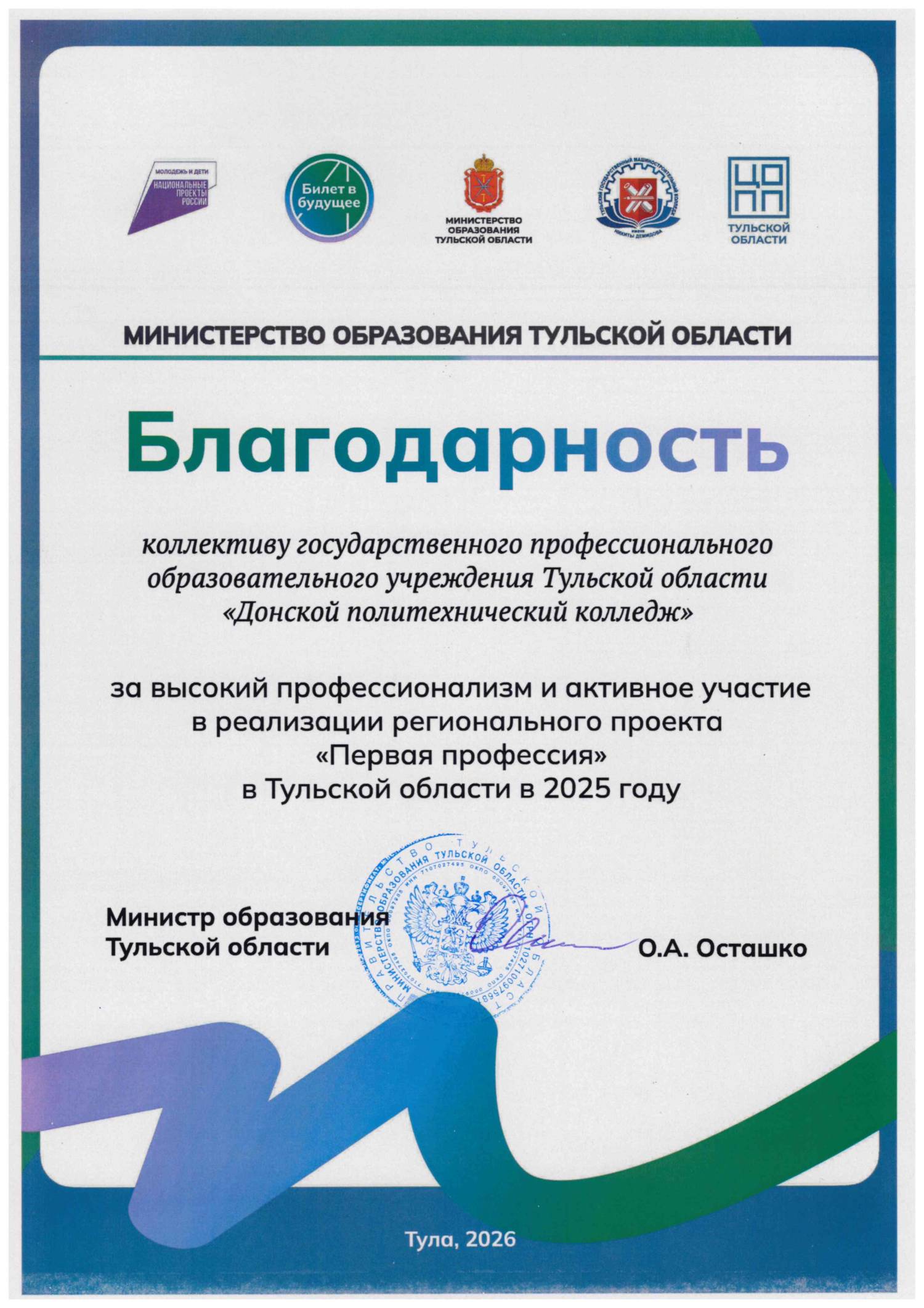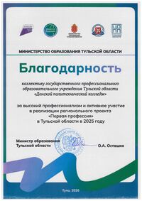 Благодарность Министерства образования Тульской области за высокий профессионализм и активное участие в реализации регионального проекта «Первая профессия» в Тульской области в 2025 году. 2026 год
