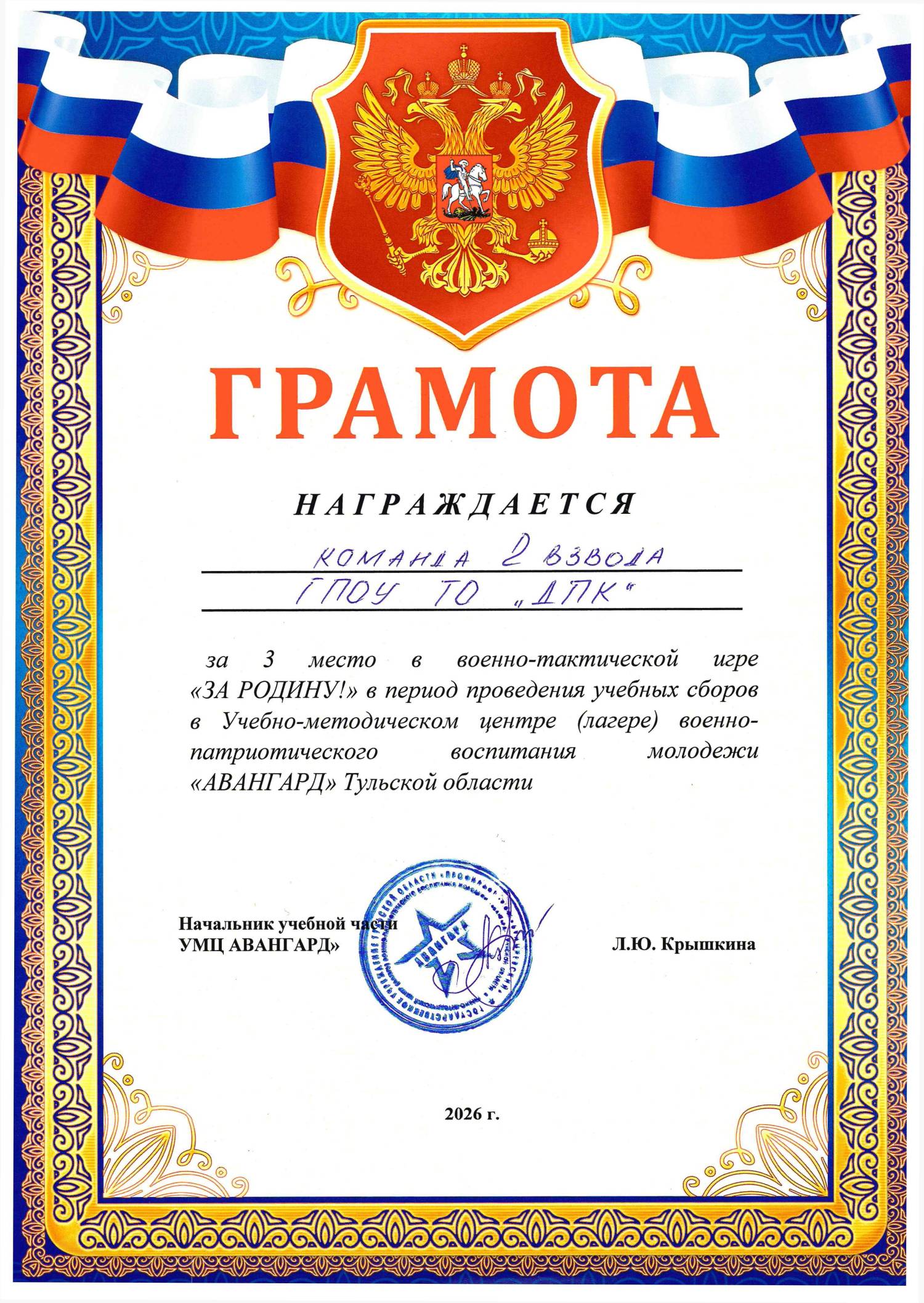 Грамота УМЦ «АВАНГАРД» Тульской области команде 2 взвода за 3 место в военно-тактической игре «ЗА РОДИНУ!» в период проведения учебных сборов в Учебно-методическом центре (лагере) военно-патриотического воспитания молодежи «АВАНГАРД» Тульской области. 2026 год