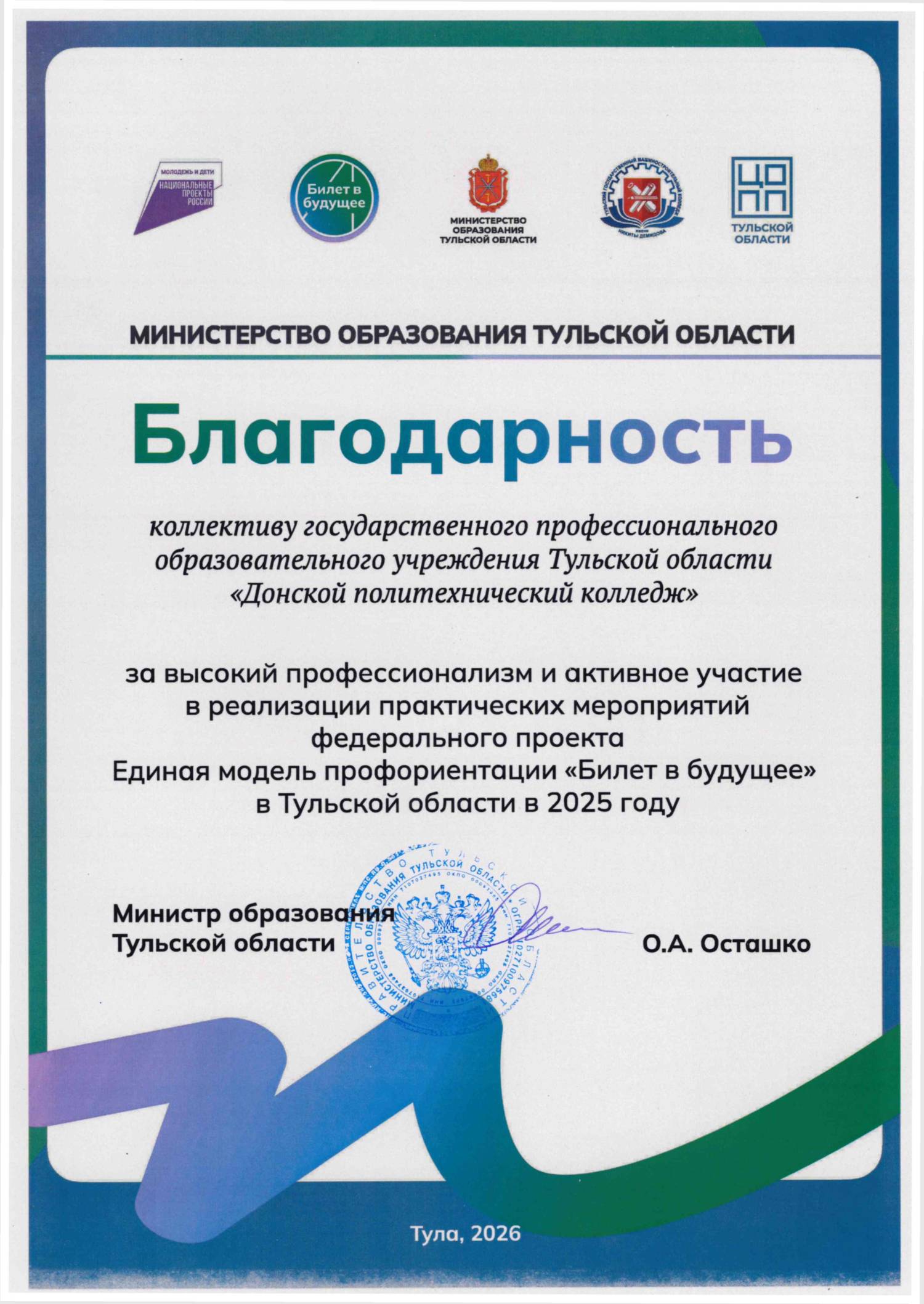 Благодарность Министерства образования Тульской области за высокий профессионализм и активное участие в реализации практических мероприятий федерального проекта Единая модель профориентации «Билет в будущее» в Тульской области в 2025 году. 2026 год